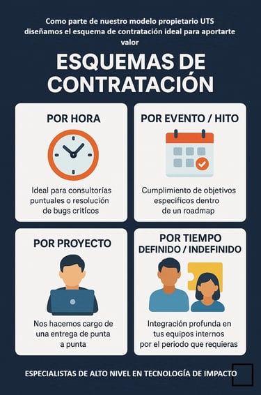 La contratación tradicional es lenta y costosa. Nuestro modelo patentado de UTS (Unified Team Synergy) te ofrece ventajas diferenciales inmediatas: